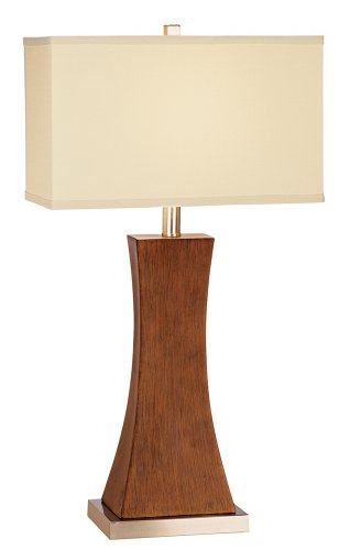 A concave-shaped, walnut-finished column forms the focal point of this modern accent table lamp. Elegantly topped by a rectangular fabric shade.